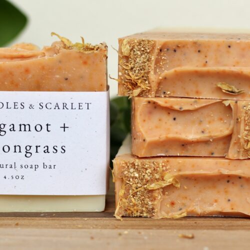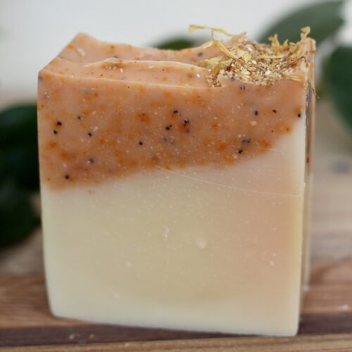 Ingredients: olive oil, coconut oil, shea butter, sunflower oil, castor oil, water, lye, lemongrass and bergamot essential oils, madder root, annatto, poppy seeds, orange peel and calendula petals.