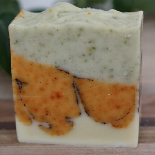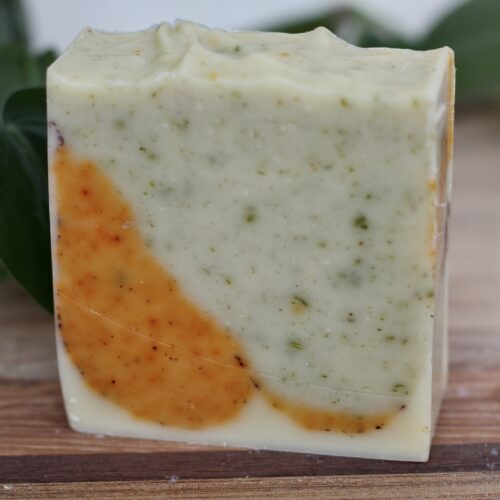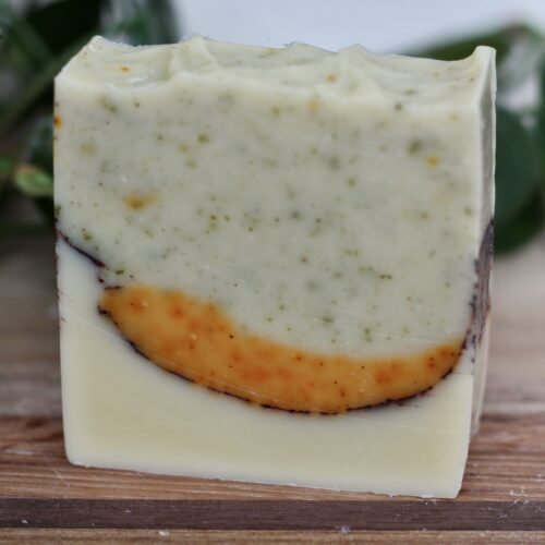 Ingredients: olive oil, coconut oil, shea butter, sunflower oil, castor oil, water, lye, orange, juniper, and fir essential oils, parsley, annatto and cocoa powder