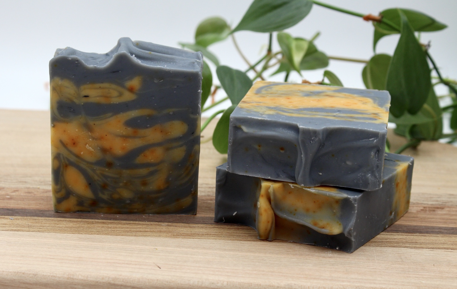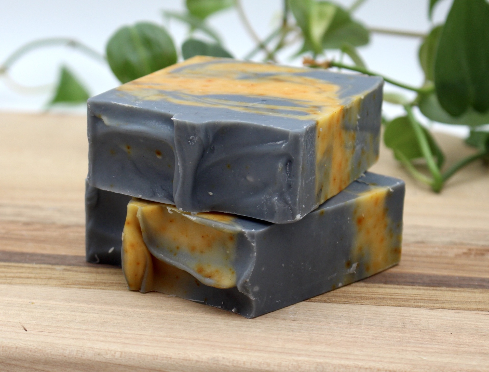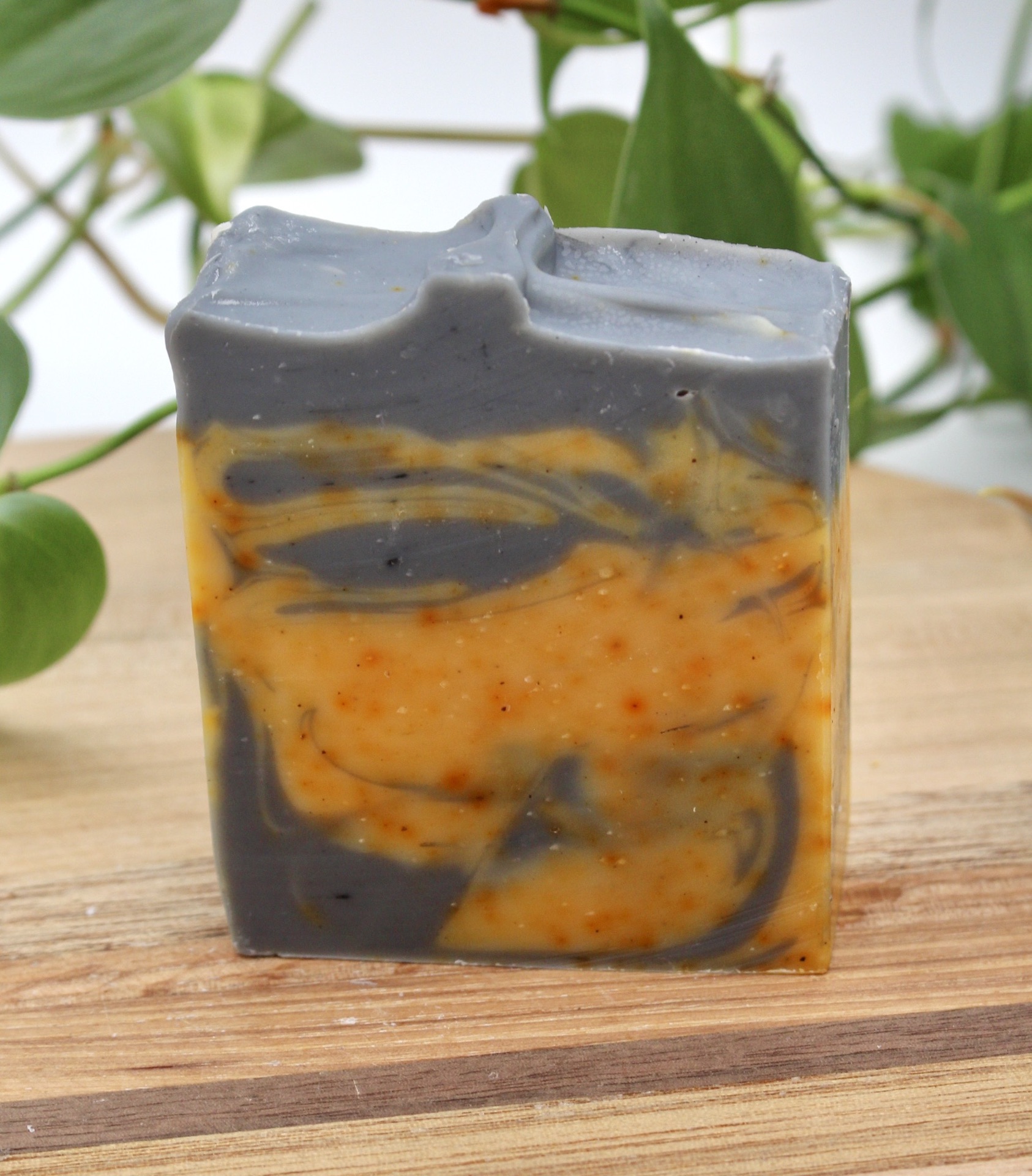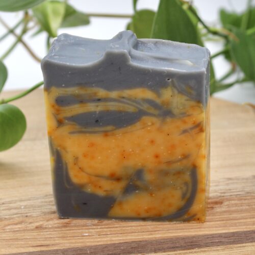 Ingredients: olive oil, coconut oil, tallow, sunflower oil, castor oil, water, lye, orange and patchouli essential oils, annatto and activated charcoal powder