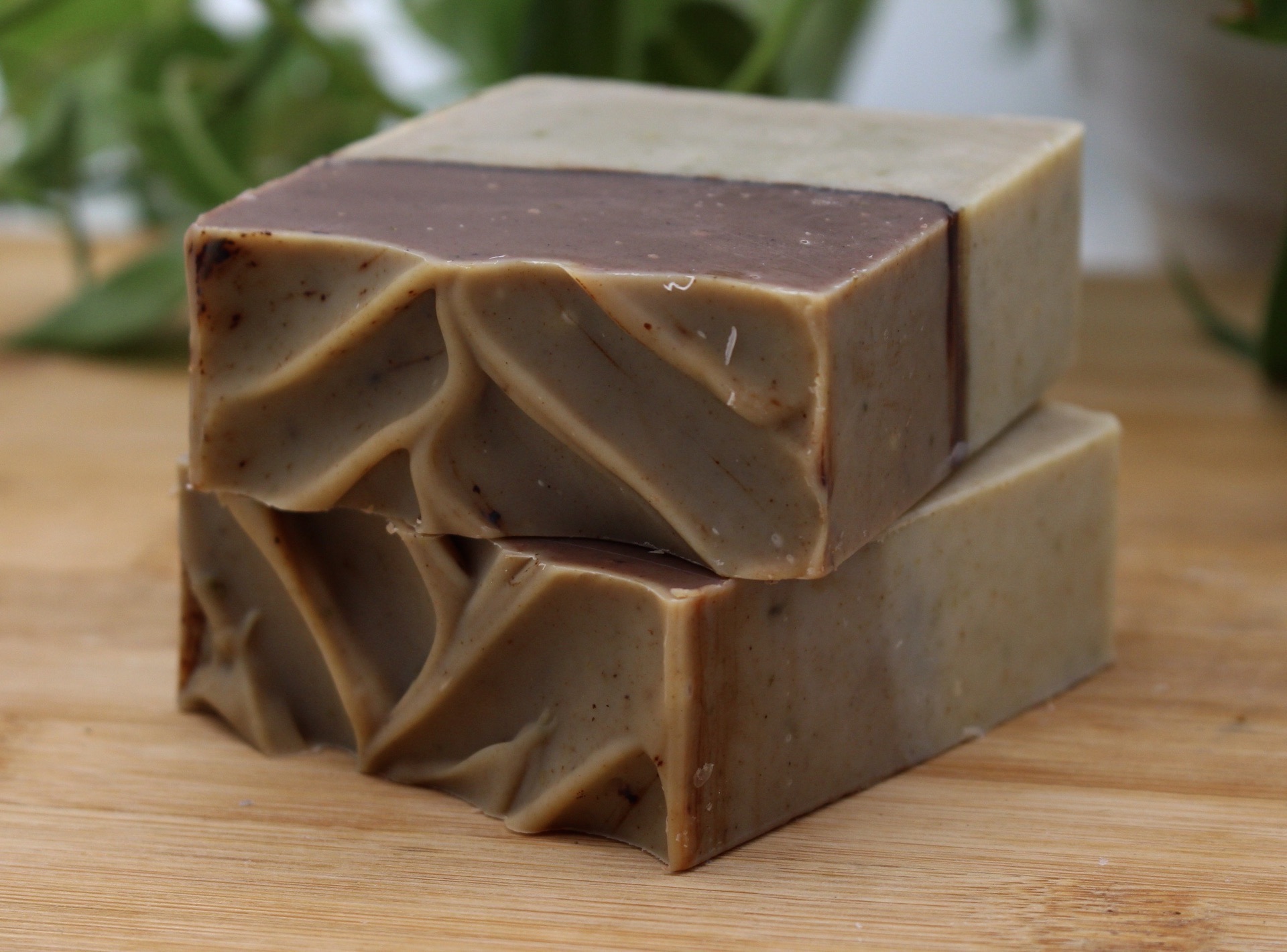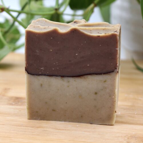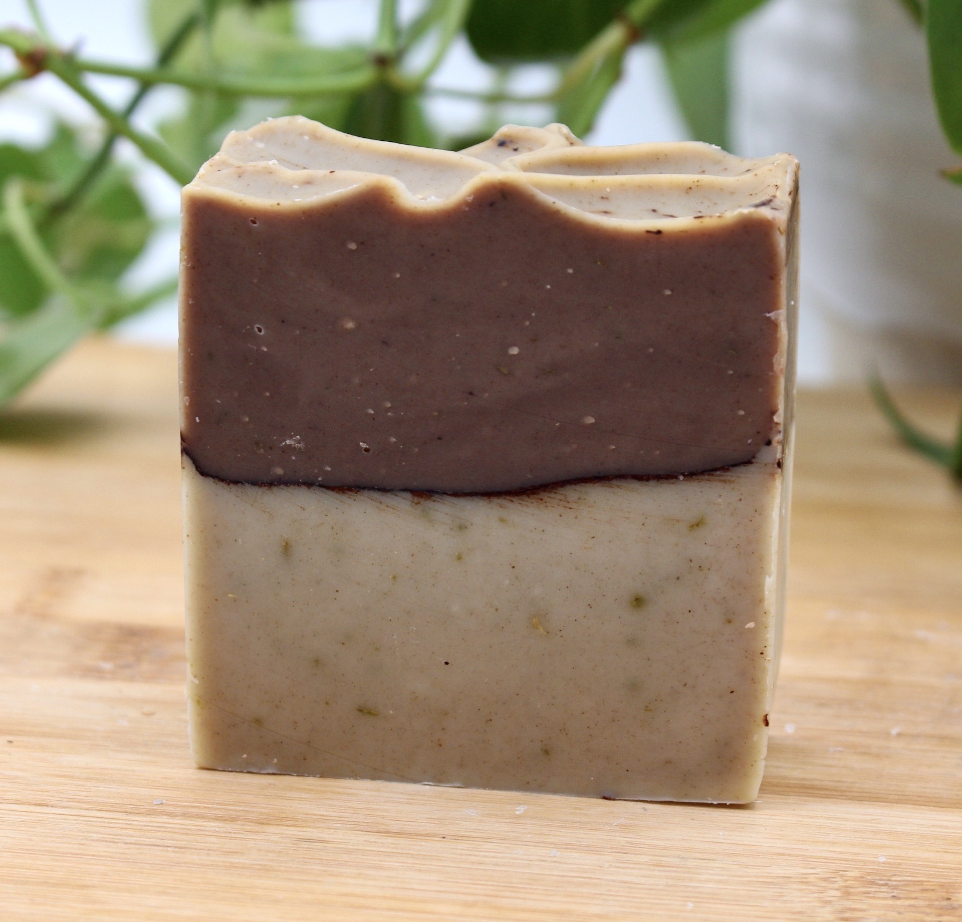 Ingredients: olive oil, coconut oil, shea butter, sunflower oil, castor oil, water, lye*, cedarwood, fir and juniper essential oils, moringa and cocoa powder
